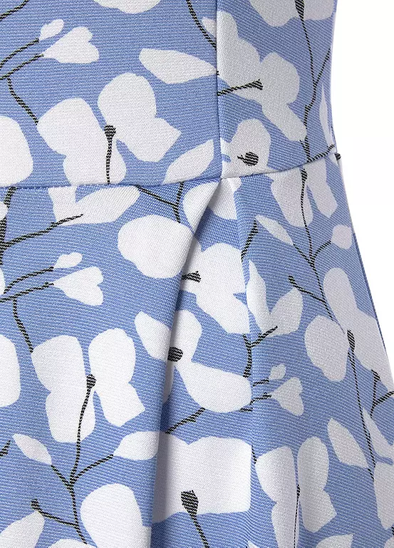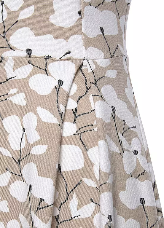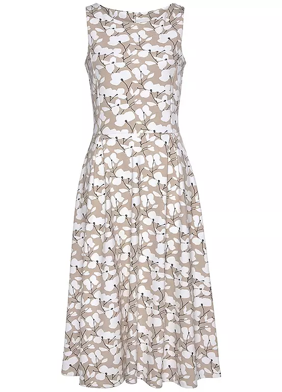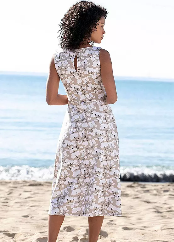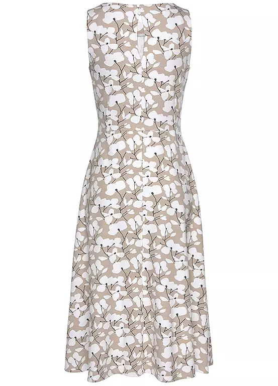 Charming midi dress with all-over print. Features crew neck, back with neck slit and button. With figure-flattering dividing seams and a wonderful summer look.