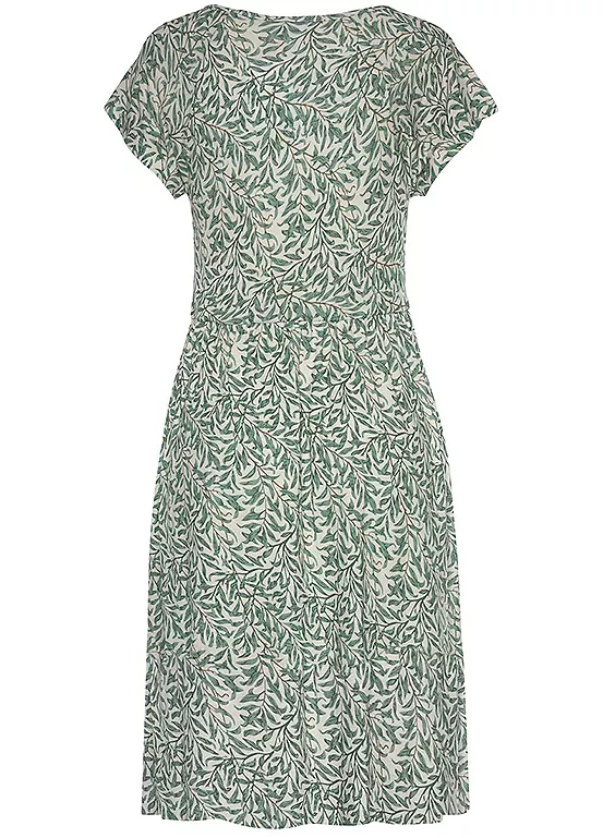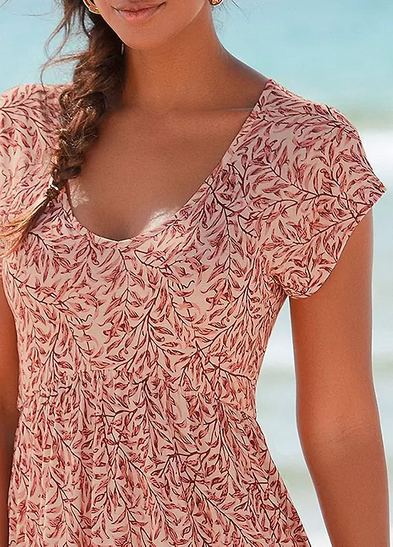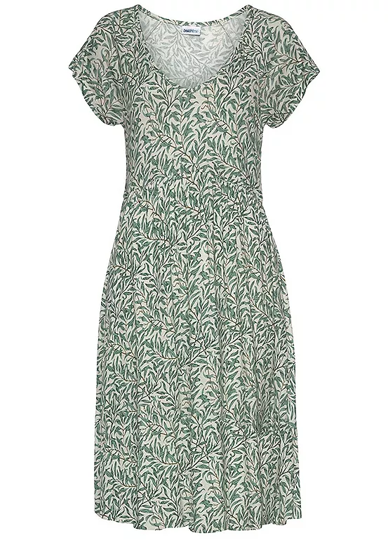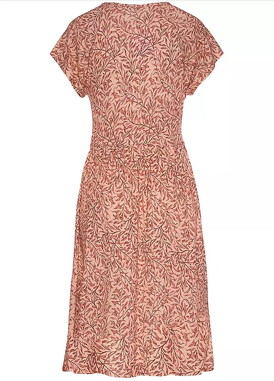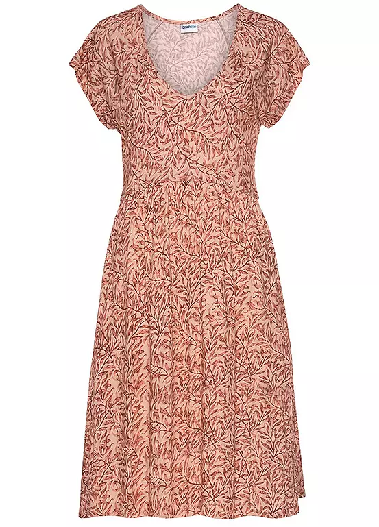 Dress by Beachtime with an all-over pattern. Deep V-neckline, short sleeves, elasticated waist. Flared hem width with attached flounce hem. Soft flowing viscose quality.