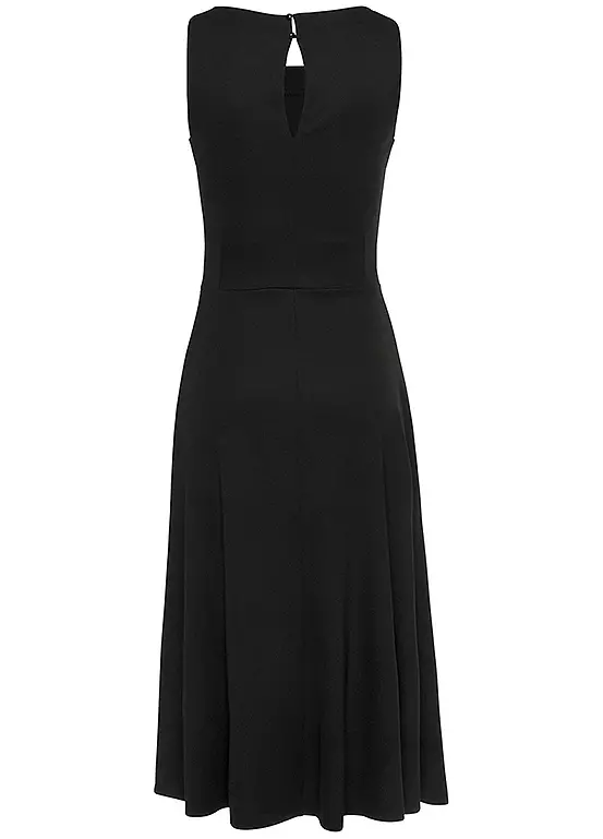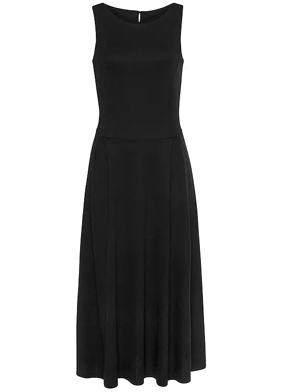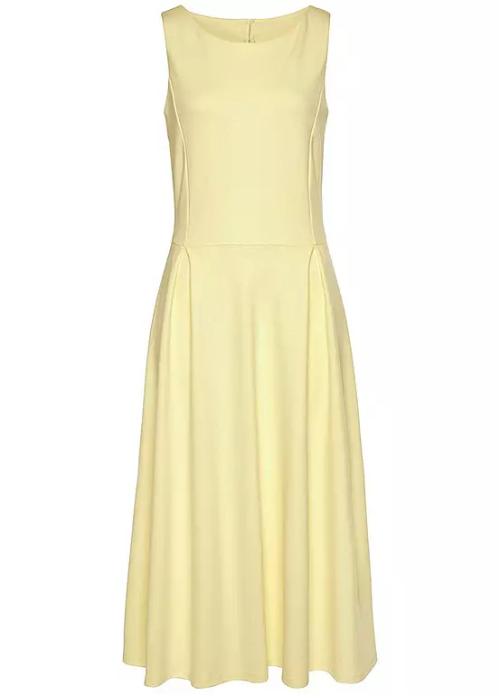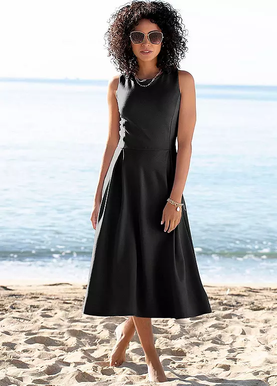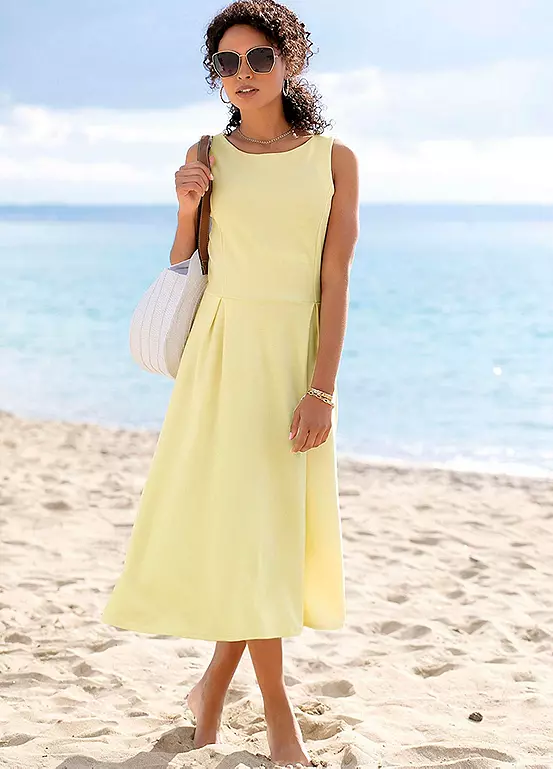 An attractive summer dress by Beachtime in high-quality jersey material with a round neckline and a partial seam in the middle, on the side and on the back. In a fashionable midi length, it features a flattering skirt part and a neck slit with a button at the back.