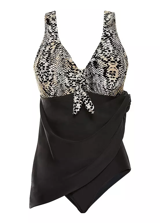 A flattering black swim dress with a contrasting colour animal print bust for a stylish look. With padded cups, bust lining, an elasticated underbust and an integrated swimsuit beneath.