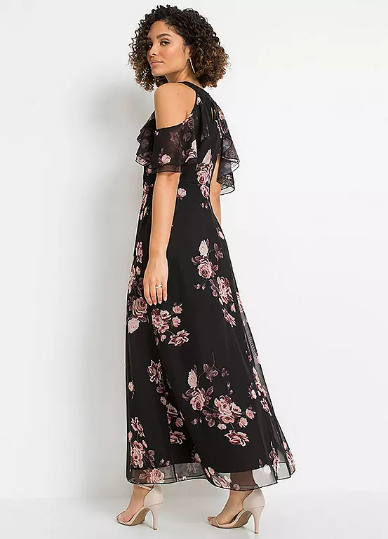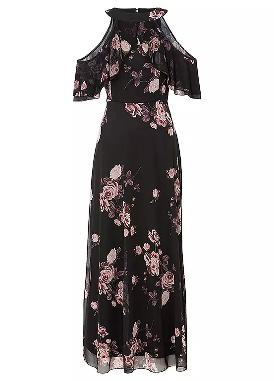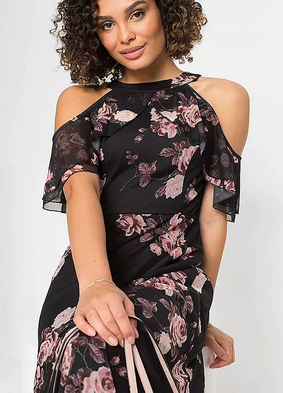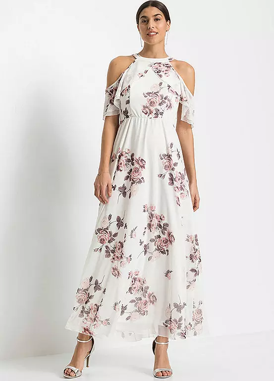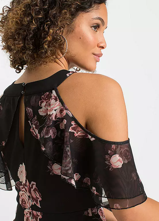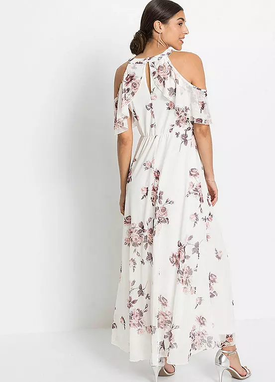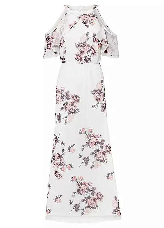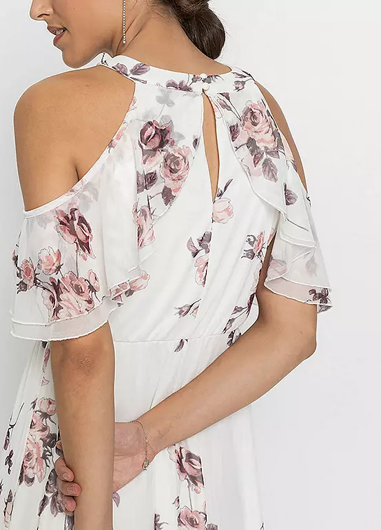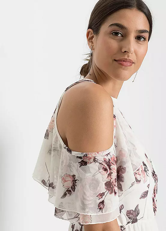 A gorgeous flounced dress with cut-out shoulders and in a beautiful floral print.