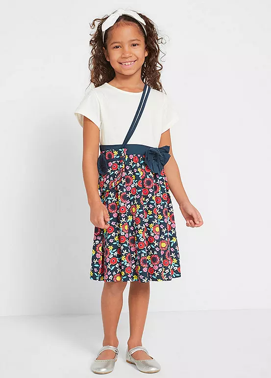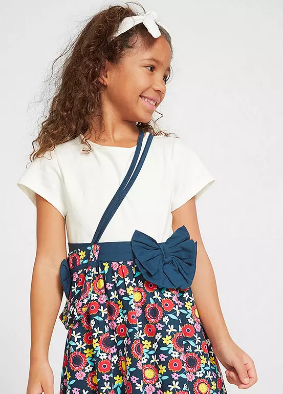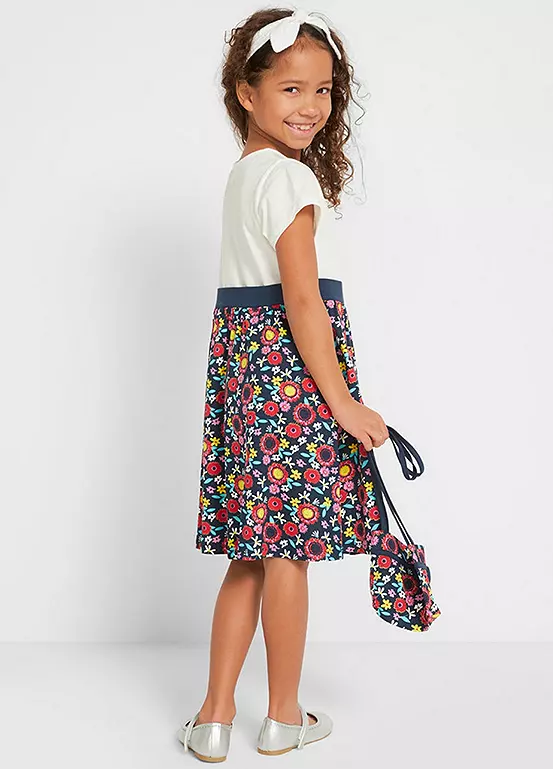 A floral print jersey dress and a matching shoulder bag.