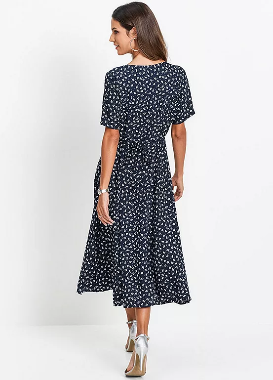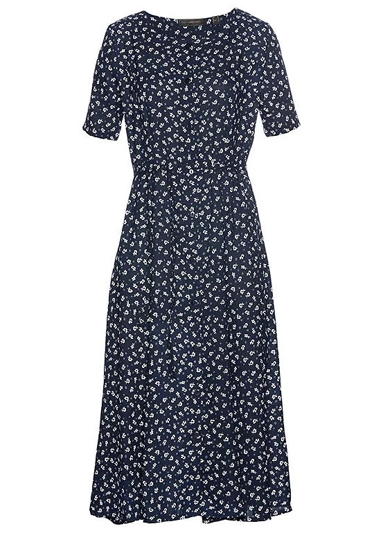 A classic cut dress featuring a button fastening down the front, side ties and a gently pleated skirt.