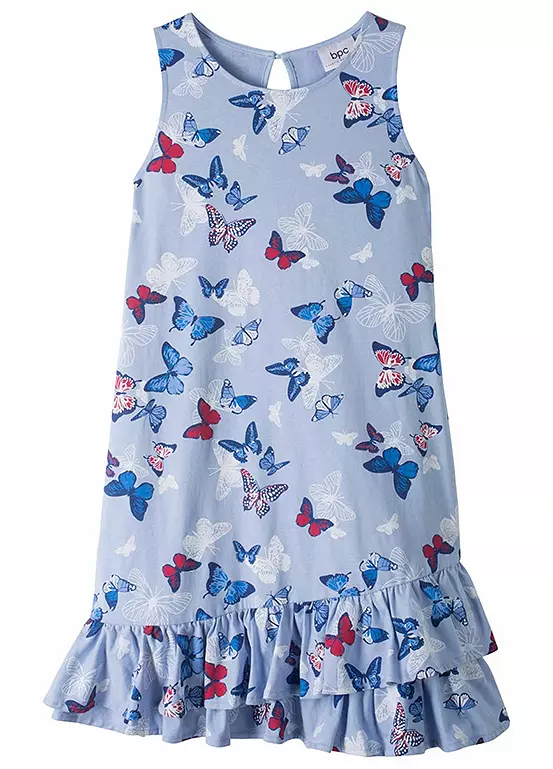A printed summer dress with ruffle trim at the hem.
