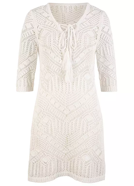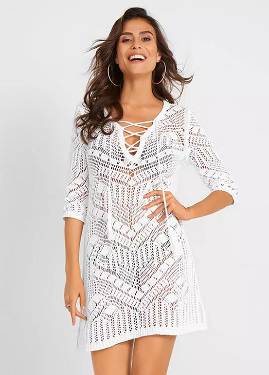 A sheer lace cover-up with a v-neck and three-quarter length sleeves.
