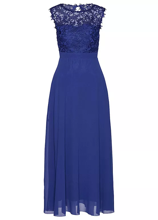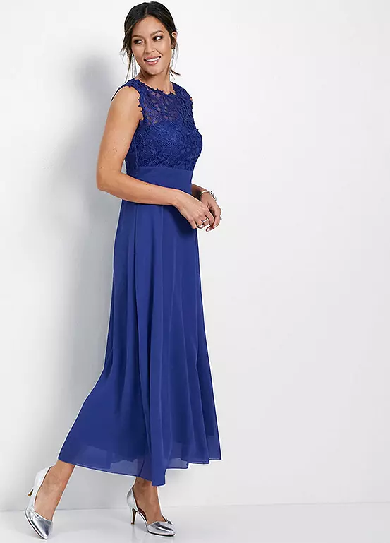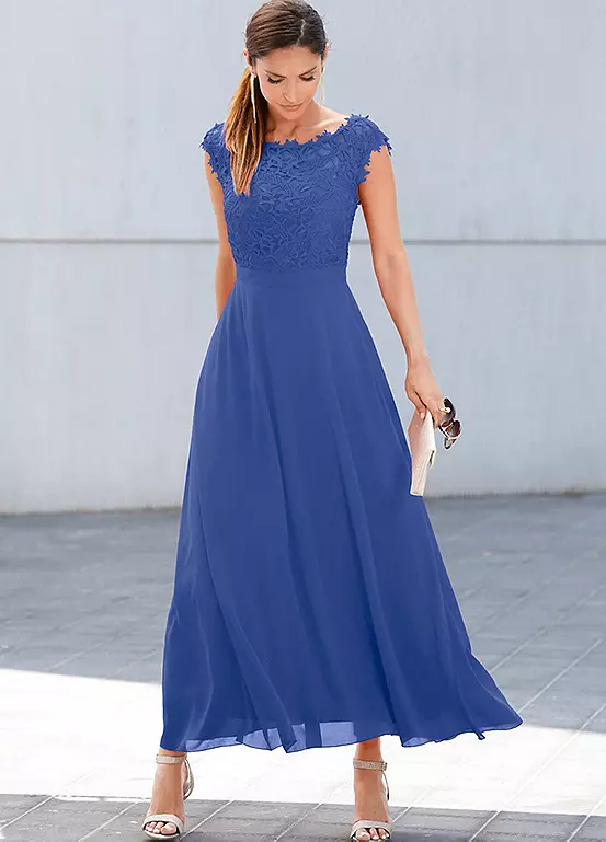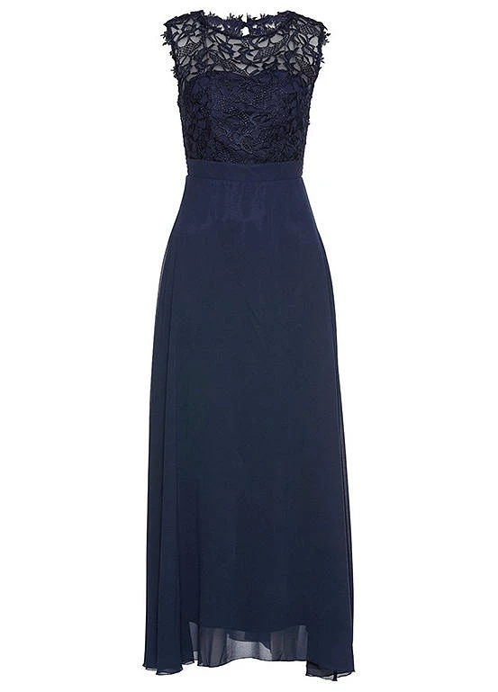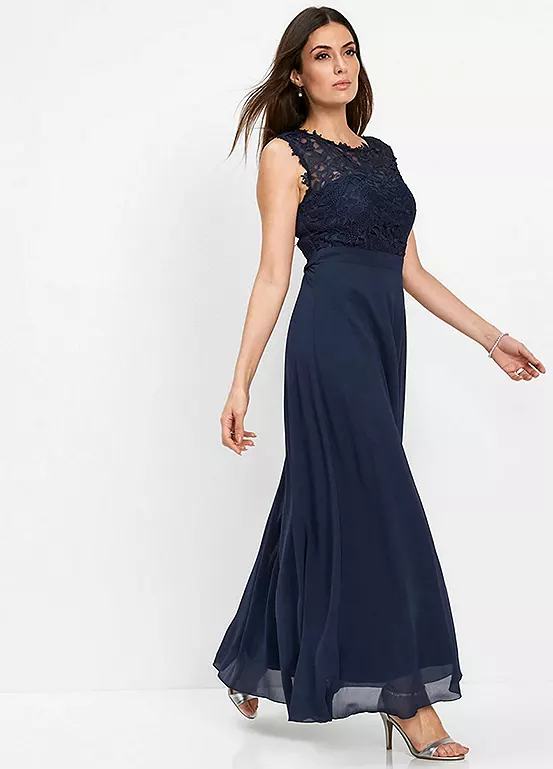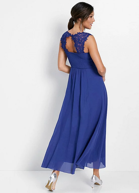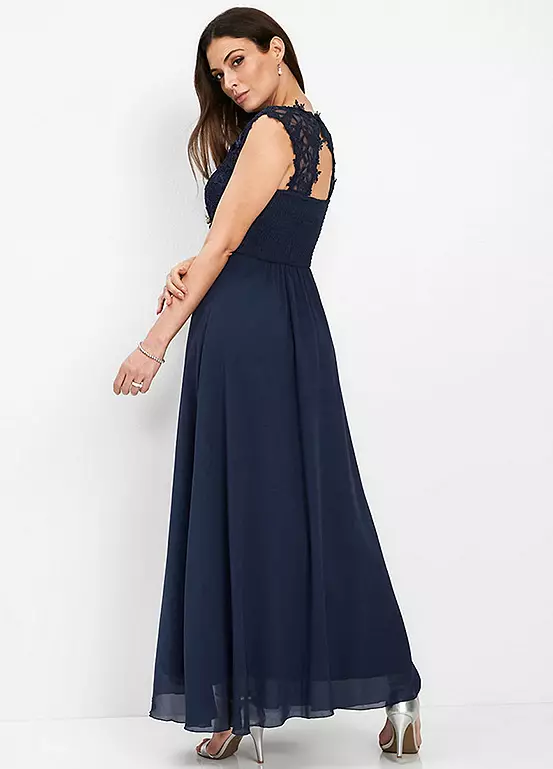 An elegant evening dress is perfect for any occasion and features a lace yoke and a cut-out back.