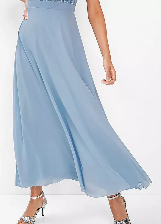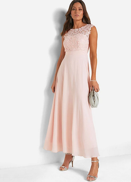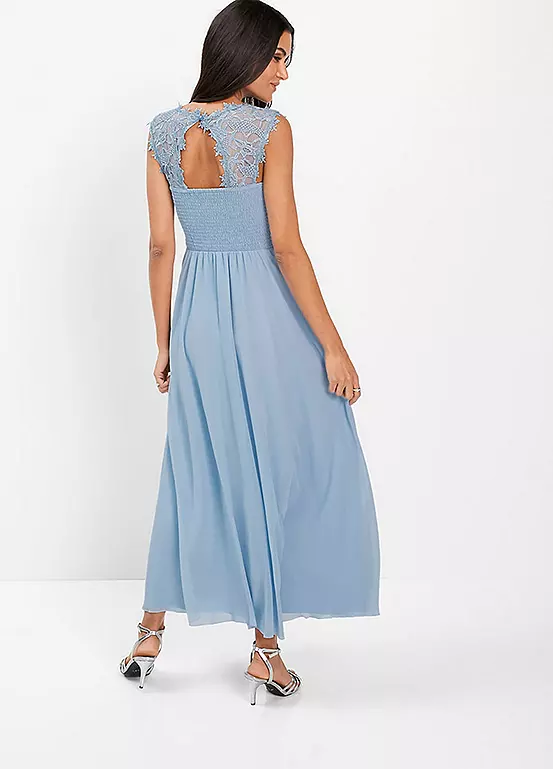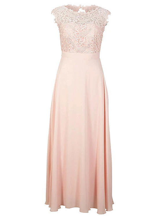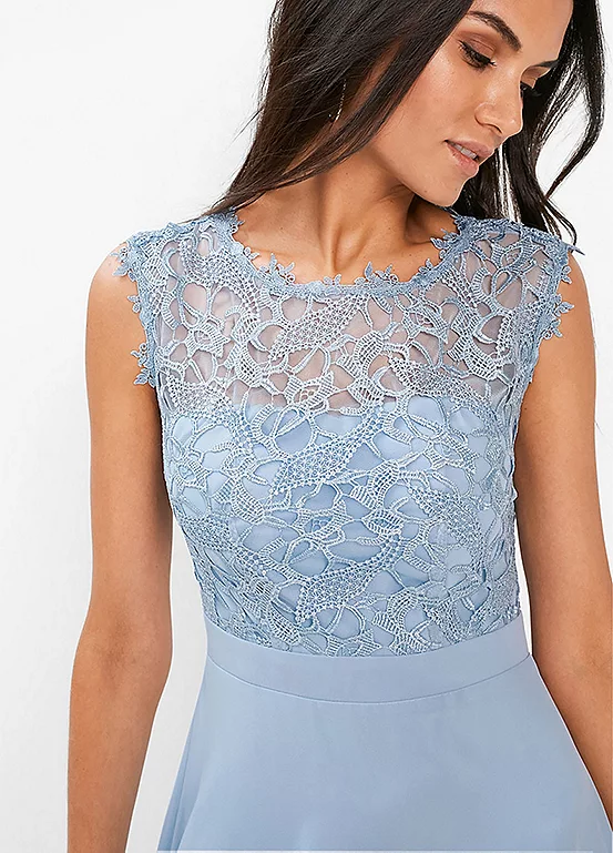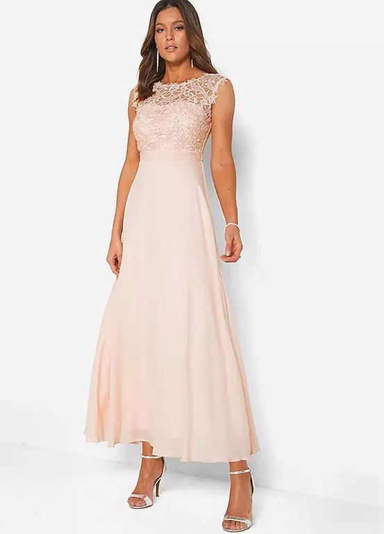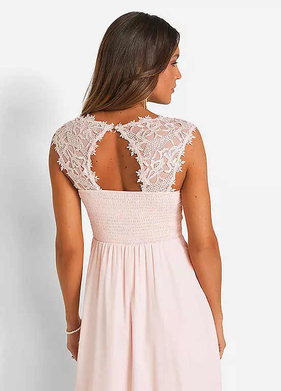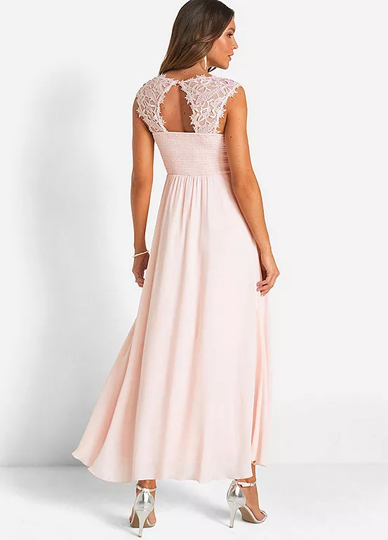 An elegant evening dress is perfect for any occasion and features a lace yoke and a cut-out back.