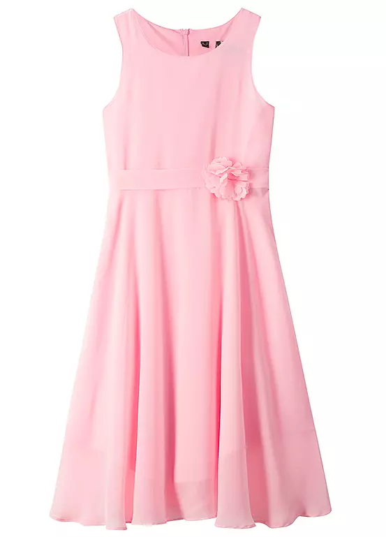 A sleeveless party dress with a floral corsage at the ribbon waist.