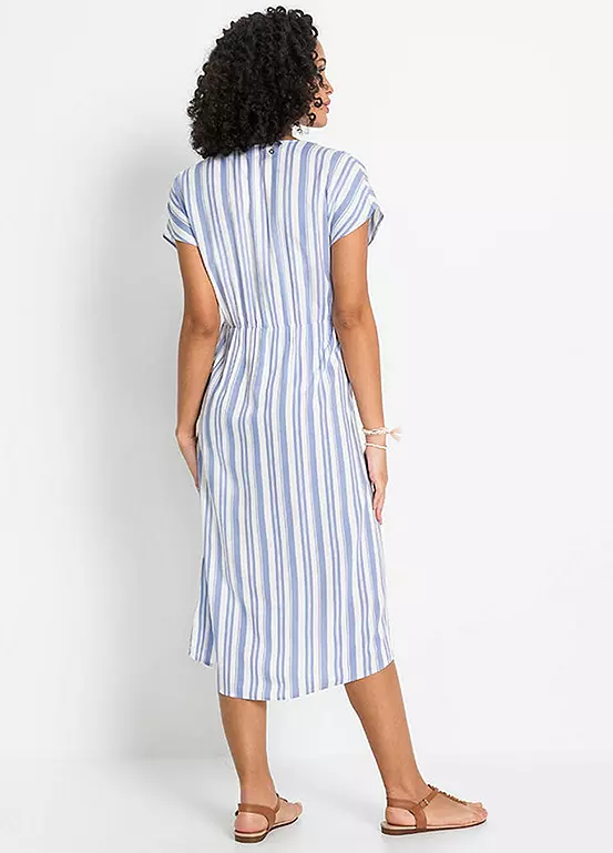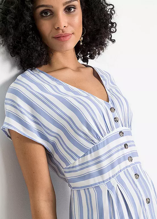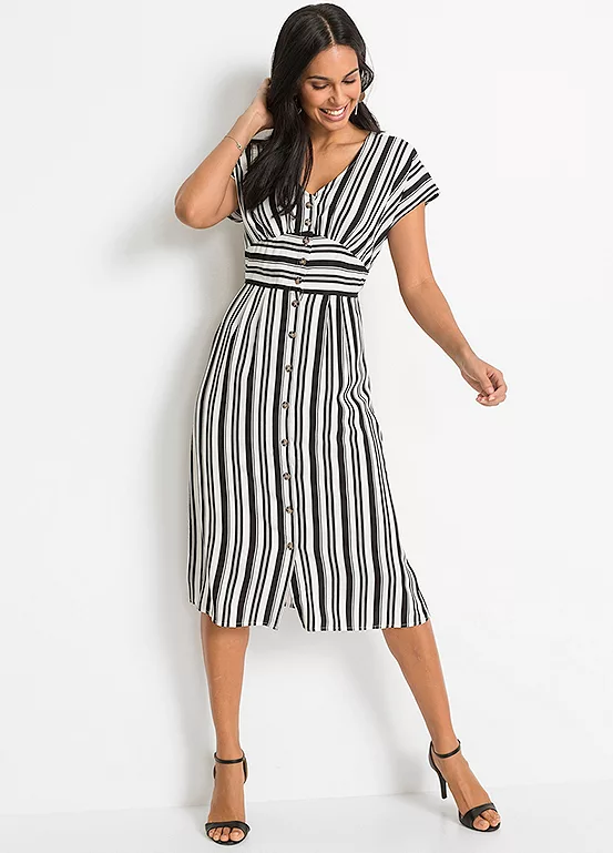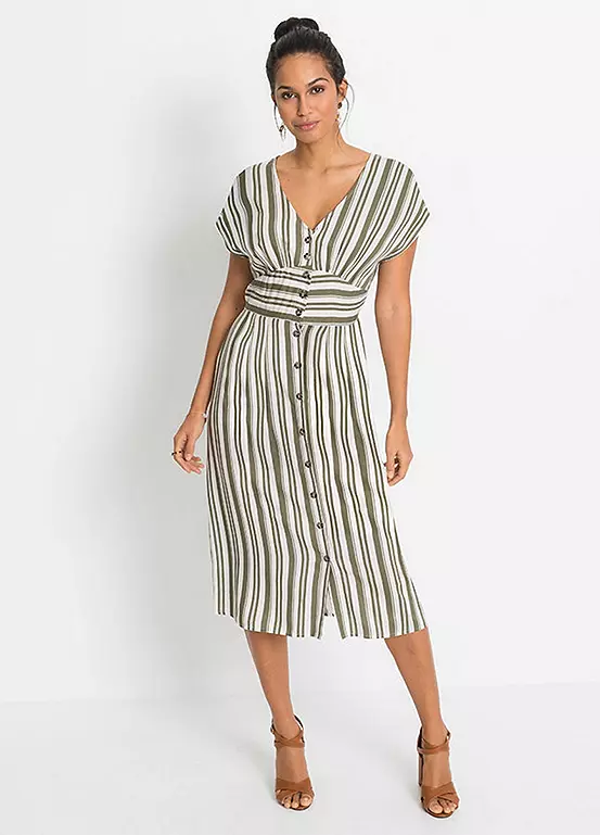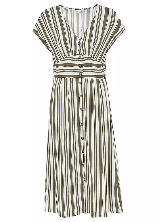 A v-neck dress in lightweight viscose with buttoning down the front and summery stripes.