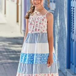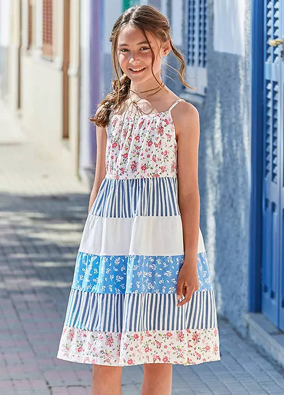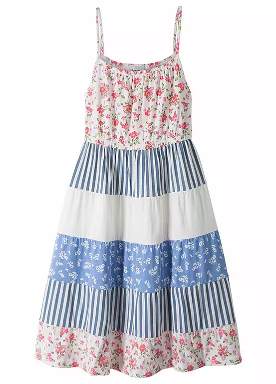 A cami strap dress with a patchwork tiered design.