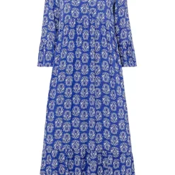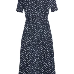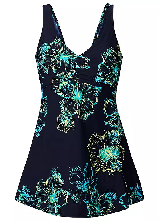 Elegantly designed dark blue swim dress with a turquoise tropical flower print and an integrated swimsuit. Along with soft cups, bust lining and an elasticated underbust, as well as shaper lining.