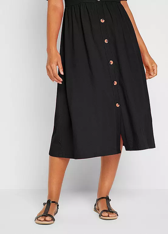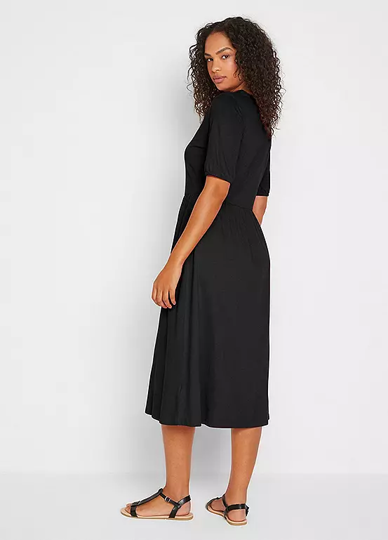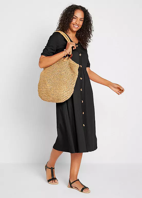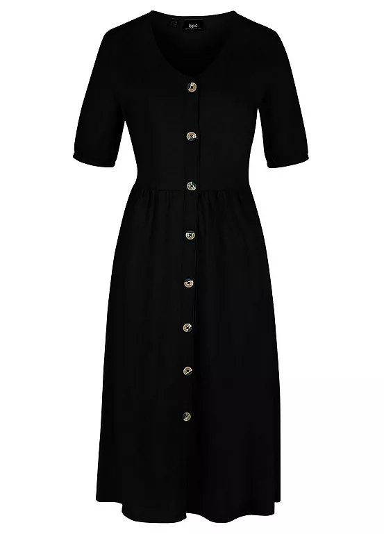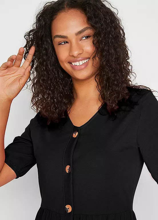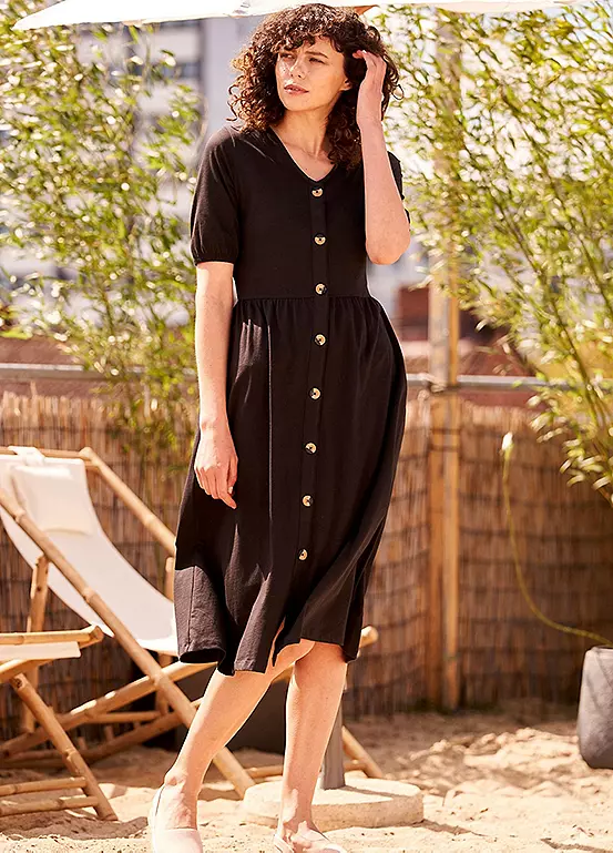 A short sleeve cotton dress with a flattering v-neck and buttoning down the front.