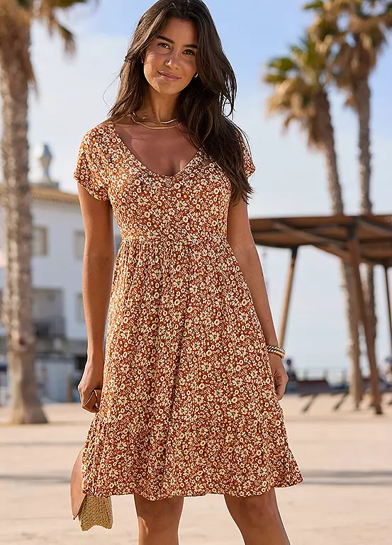 This dress is just the right addition to your wardrobe for all ladies who like a vintage look. Printed with flowers, it is gentle on the skin thanks to the soft jersey fabric. A romantic v-neckline, short sleeves, a stretch band edged under the chest and a wide skirt with flounces make it the perfect companion on hot summer days.