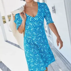 Shake away those winter blues with our updated best selling shape! Bonnie is our simple-ish yet super fun blue pineapple print tea dress . Love the print? Want more? Look at Lacey our matching print T-shirt.