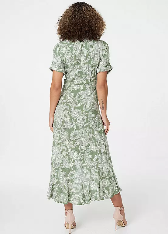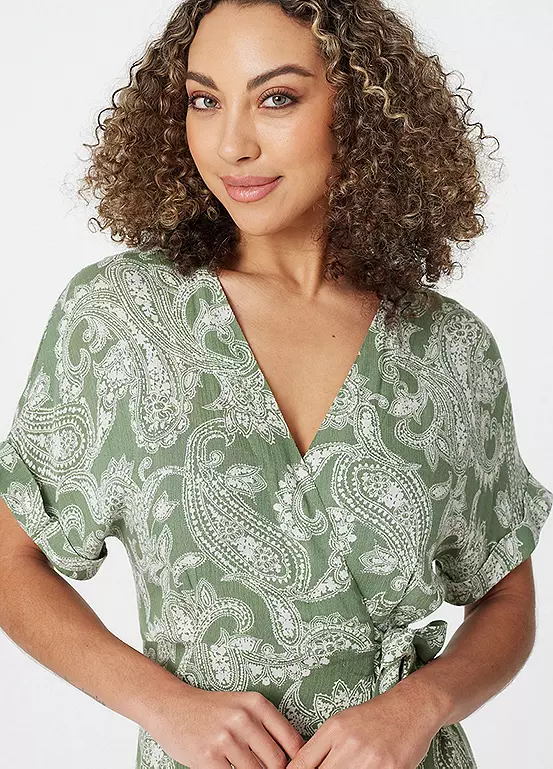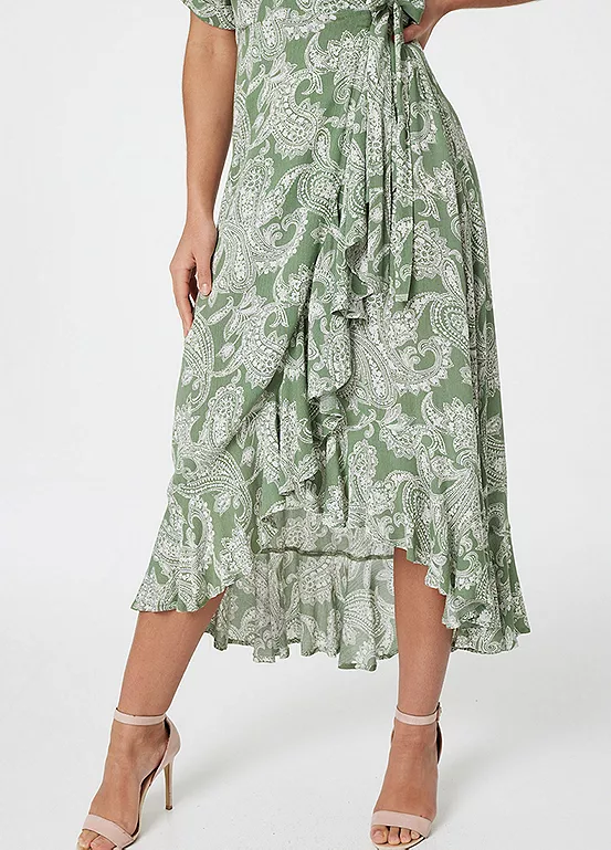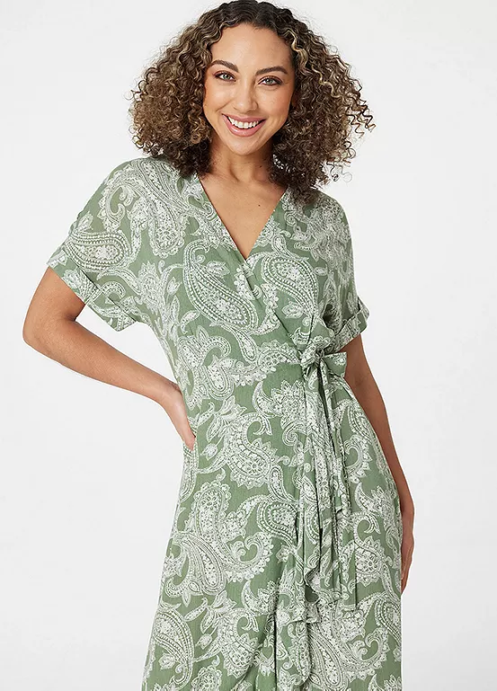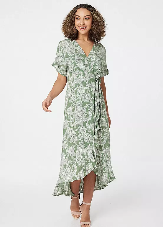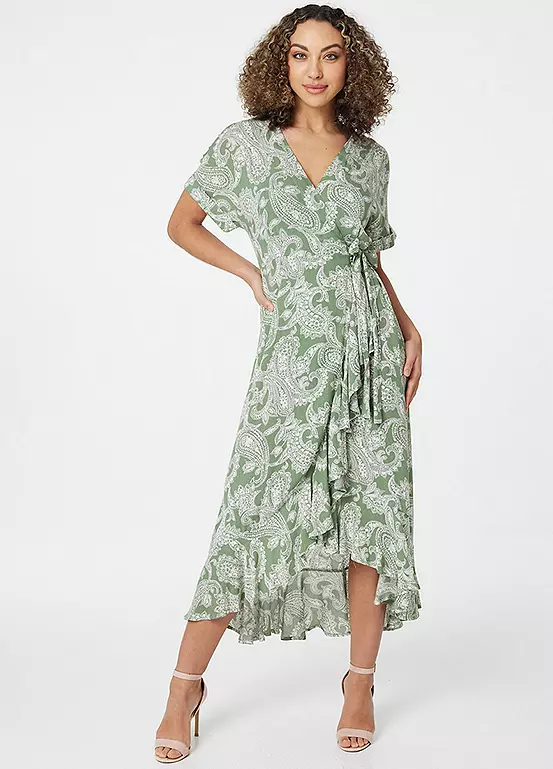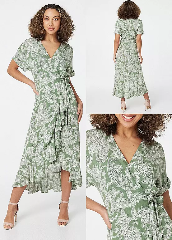 Add a paisley print to your dress collection with this short sleeve wrap midi. Made from 100% viscose, it has a V-neck, short turn up sleeves, a self tie front and a tiered midi skirt. Style with blush heels for a chic warm weather look that’s perfect for a day at the races or a daytime wedding.