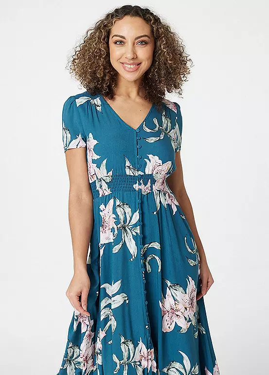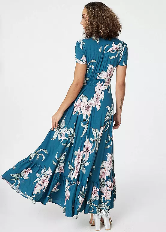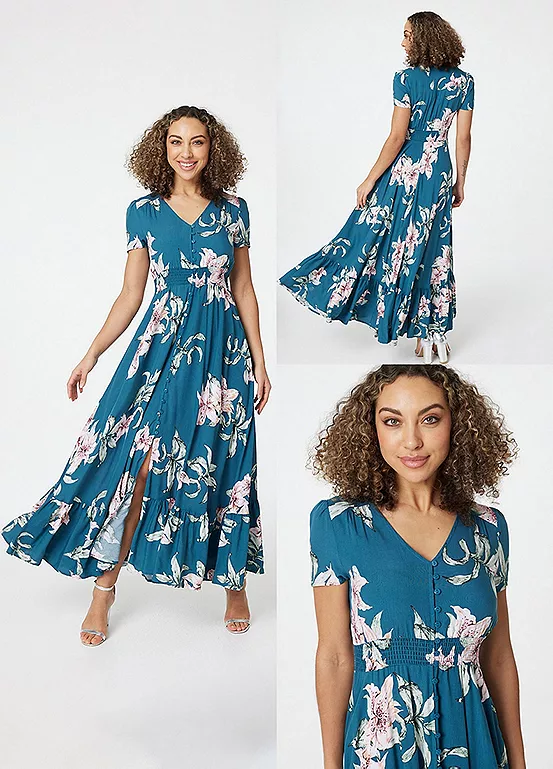 Every closet needs a vibrant maxi dress like this one. With a V-neck, button front, short sleeves, a shirred waist and a flared maxi length skirt. Made from 100% breathable viscose, it’s the perfect addition to you’re your weather capsule wardrobe. Pair with neutral heels for a chic style that’s great for a daytime occasion.