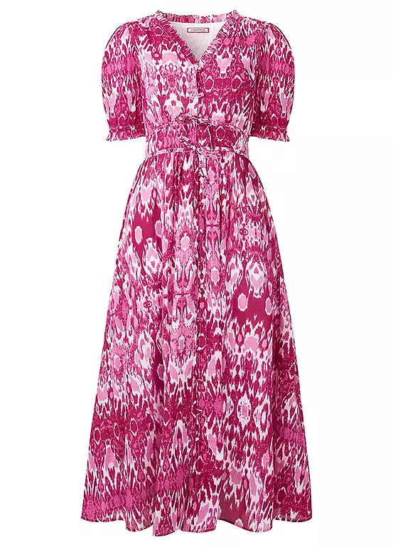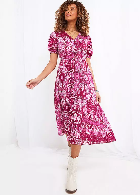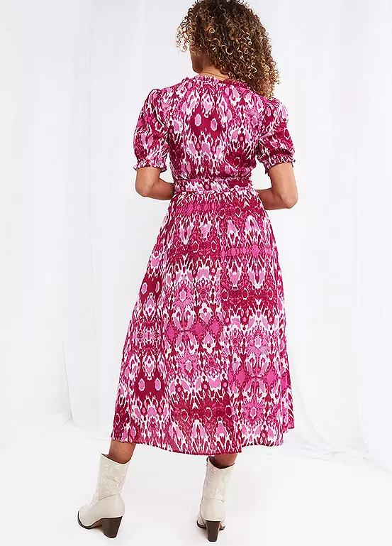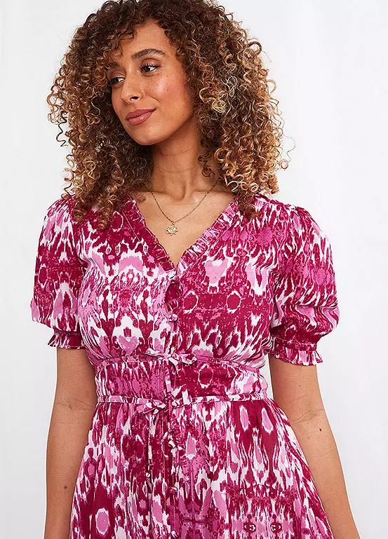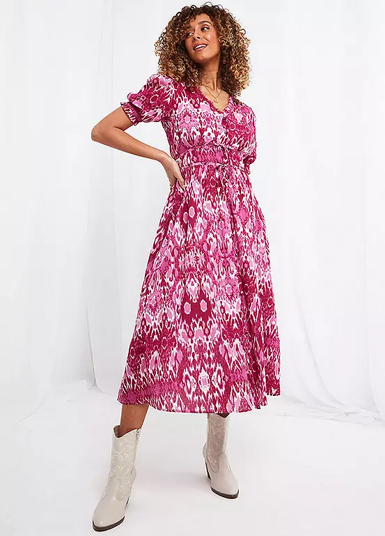 Hands up – who loves pink? We certainly do, which is why this V-neck midi dress is one of our favourite looks of the season. Complete with frills, puff sleeves and pretty waist ties, it’s full of feminine features that’ll leave you feeling fabulous.