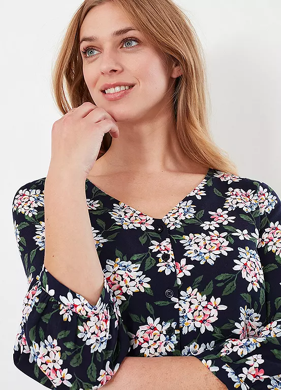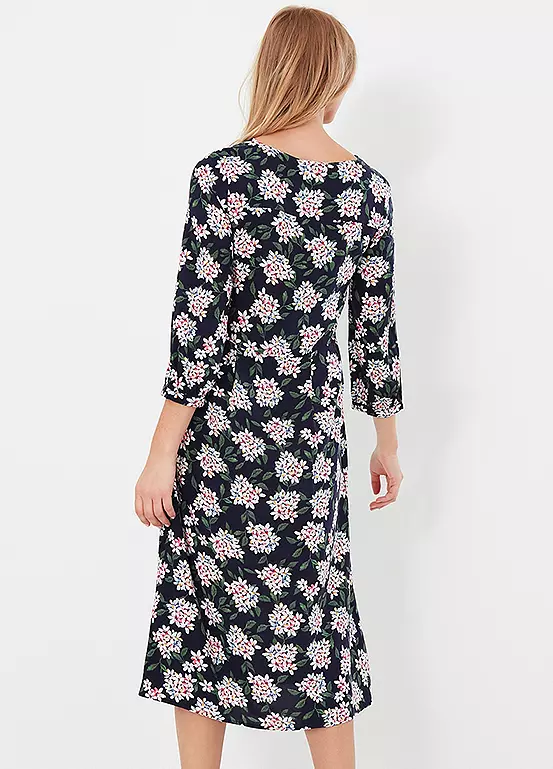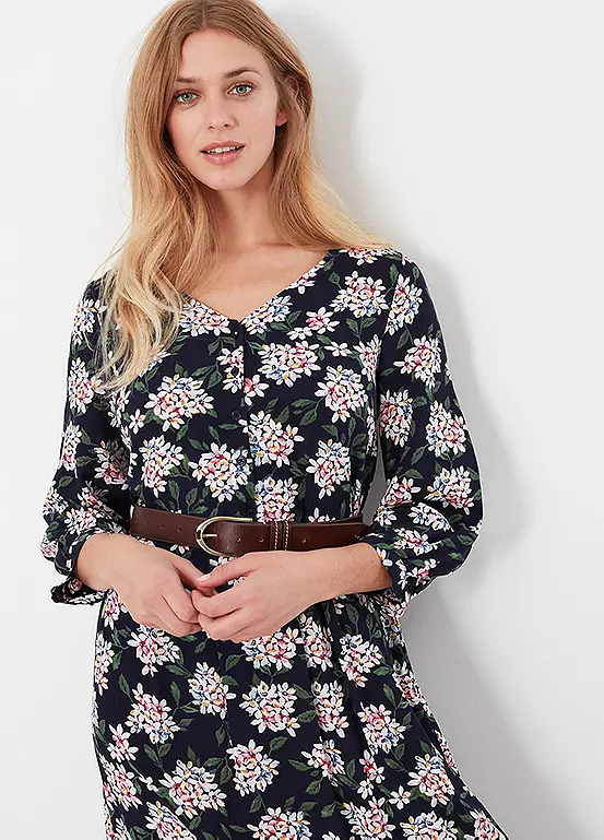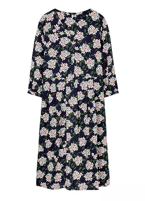 A woven printed midi dress featuring a button placket, pleat detail at the waist, forward shoulder seam and back neckline tape.