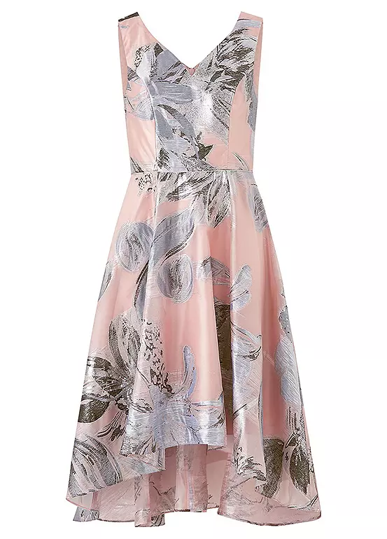 Our timeless prom-style dress is crafted from a floral blush and silver metallic jacquard fabric and features a V-neckline the skirt is hi-low style. It’s fully lined and is perfect for all your special occasions.