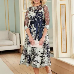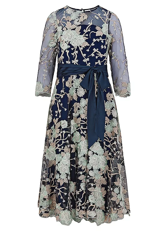 This gorgeous navy and mint embroidered prom dress gives you the perfect occasion look. It’s a fit and flare style with a scoop neckline and a three-quarter sleeves and satin belt detail to the waist.