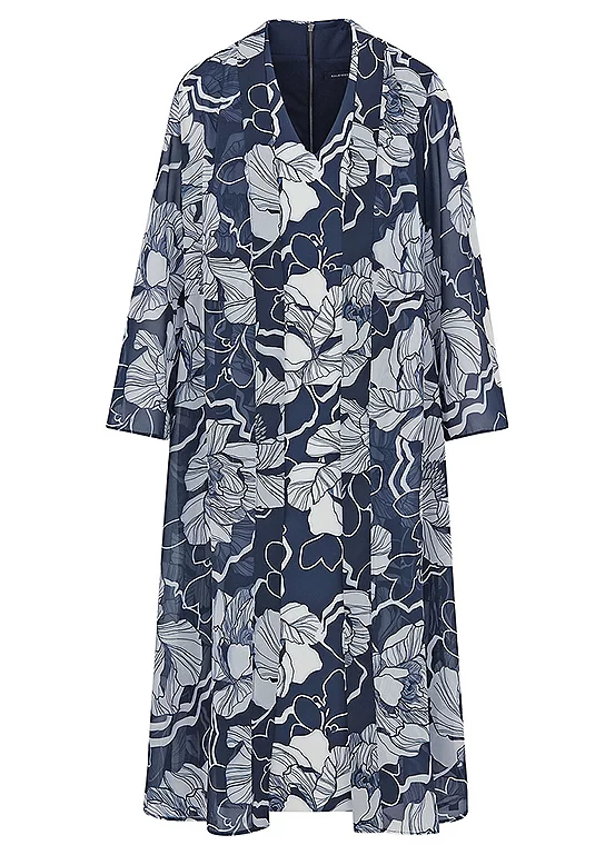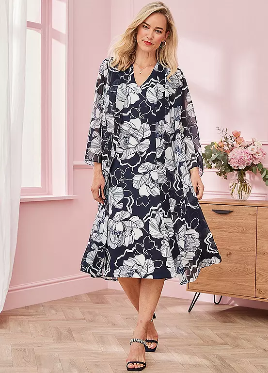 The matching print chiffon jacket has three-quarter length sleeves and gorgeous pleat detail to the back.