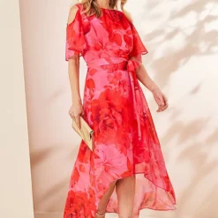 Create a fabulous look when ever you wear this pink floral print hi low hem dress, with cold shoulder detail and self fabric tie belt. It’s the perfect dress for all your occasions.