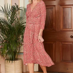 Our best seller is back! This time in soft touch jersey fabric in a fabulous orange animal print. Flattering wrap over bodice, figure hugging at the waist with wrap around tie detail. Flared full skirt allows for beautiful movement.