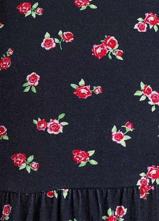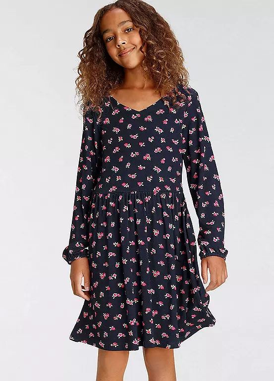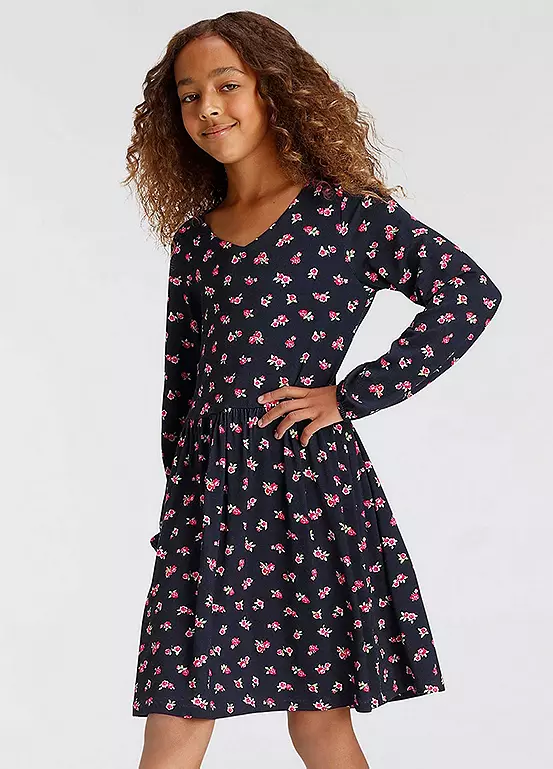 A stylish jersey dress for girls by KangaROOS in a knee-length cut with a flared skirt. It comes in an all-over floral print with elasticated cuffs on the long sleeves and is comfortable to wear thanks to the stretchy material.