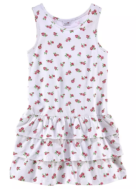 Perfect for the summer thanks to the pretty all over floral print, this dress is narrower at the waist and is cut just above the knees and features a round neckline and flounce hem.