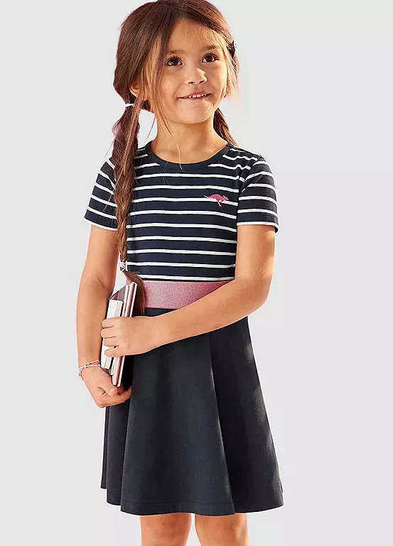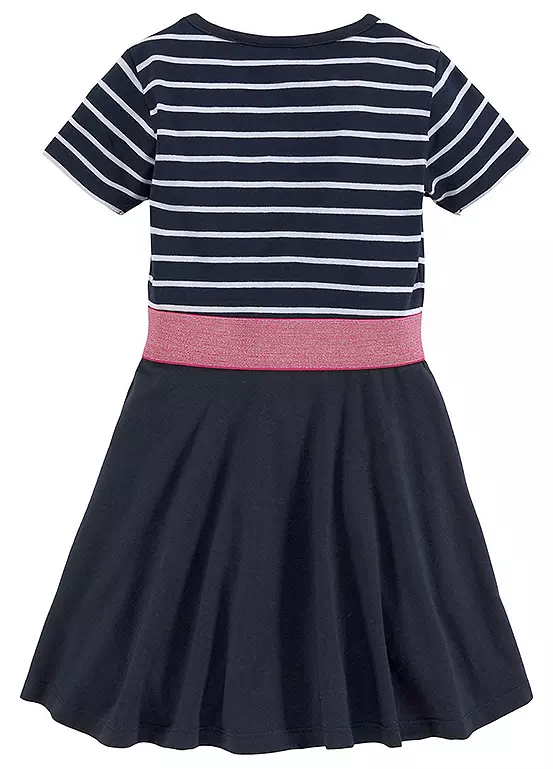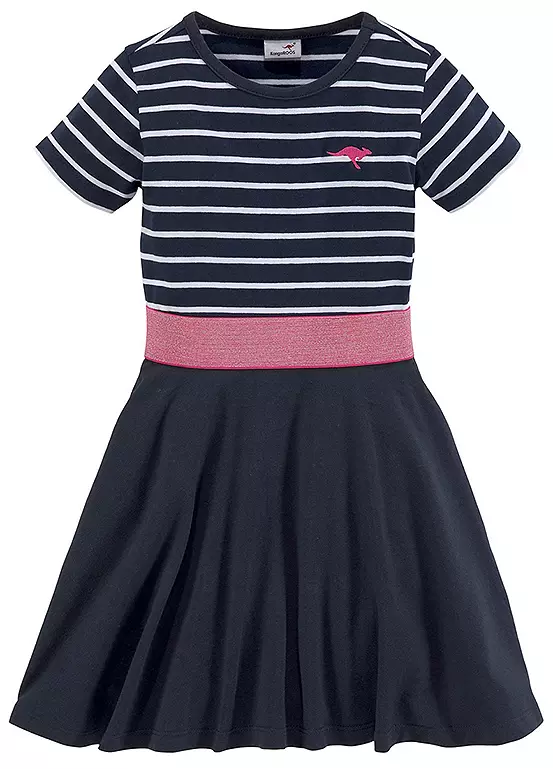 It’s wider at the bottom and hits above the knees. Due to the torso with elastic waistband, the width is a perfect fit. The short sleeves end with an edge. The dress is made of a soft and stretchy material and is therefore very comfortable.