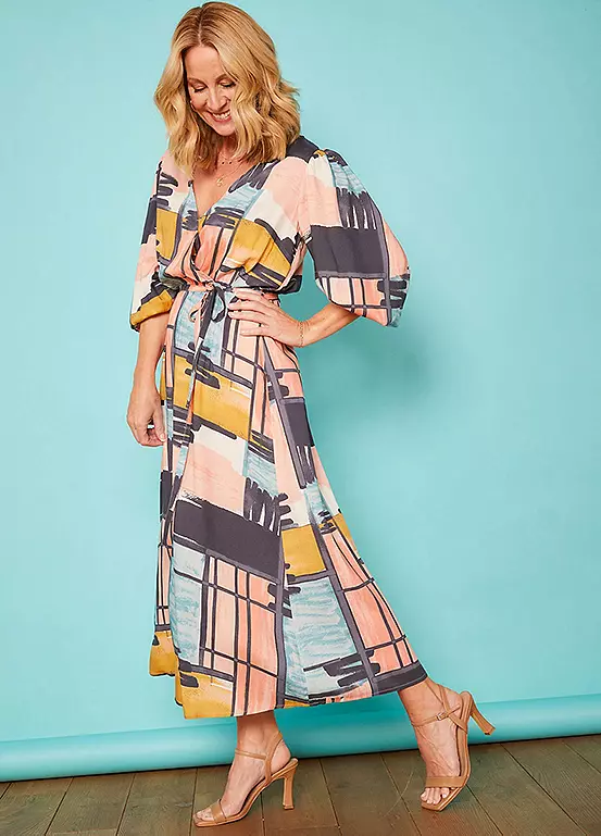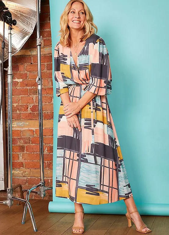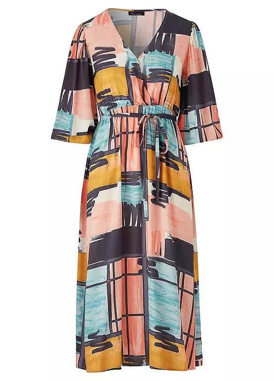 Another beautiful printed dress designed with a mock wrap front. Half blouson sleeve with elasticated cuff. Exclusively designed for Love Mark Heyes range.