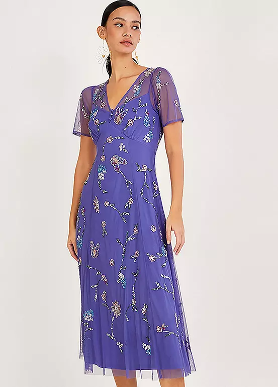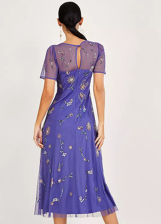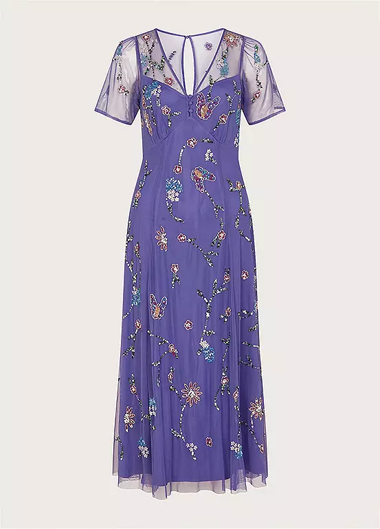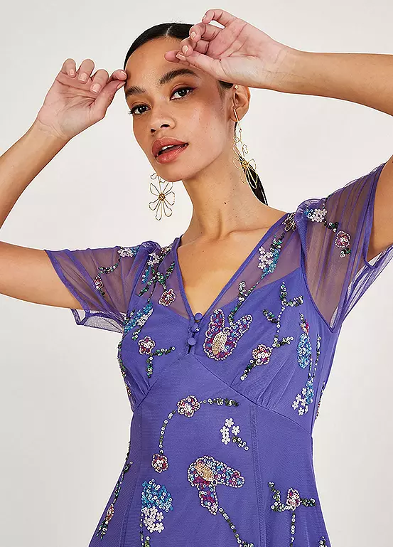 Our Kathy dress renews our love for the colour violet, with graceful floral embellishments that create the perfect evening option. Seam detailing defines the bust alongside three fabric-coated buttons to the neck, whilst the bodice boasts a mesh finish through the sleeves and chest. Skating over the hips and out into an A-line cut, the wispy skirt falls to a midi length. Fastens with a zip and keyhole button on the reverse.