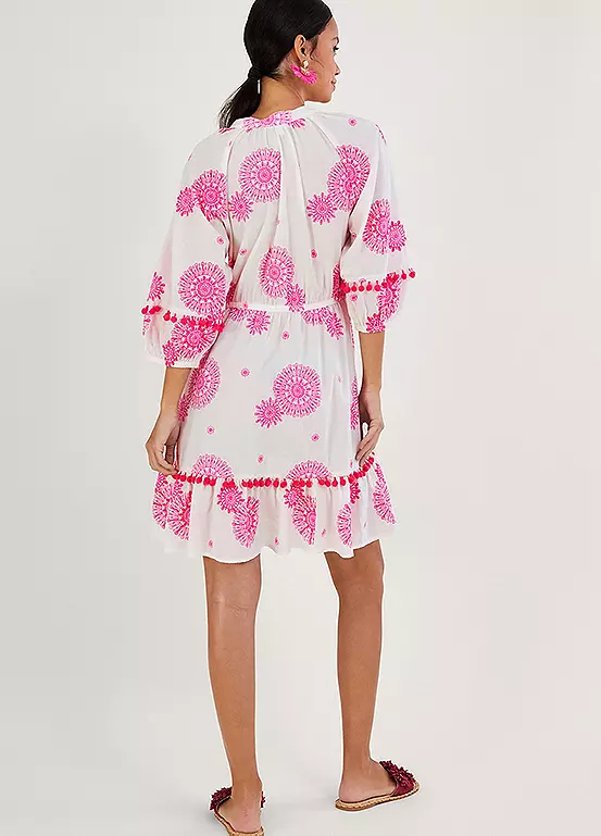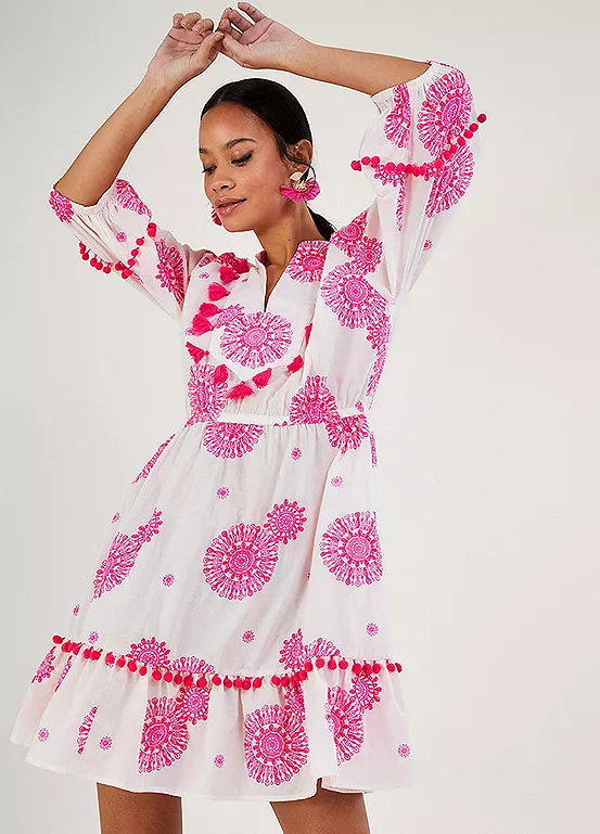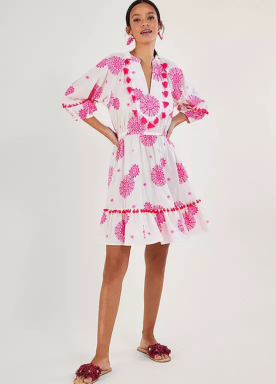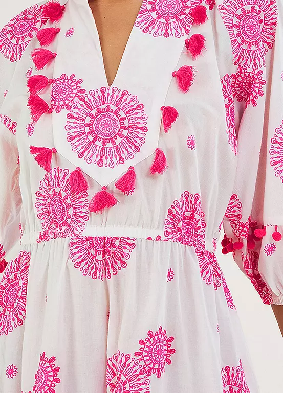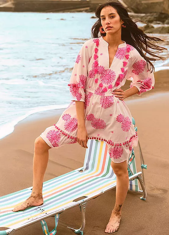 We’re in love with the pops of pink on this kaftan dress. Scattered through the piece is a fuchsia medallion print, with fun bobbles and tassels that run through the neckline, sleeves and hem. Simply pop it on over your swimwear with your towel and book in hand and head to the sun lounger.