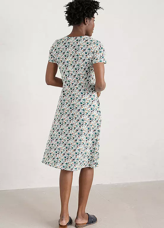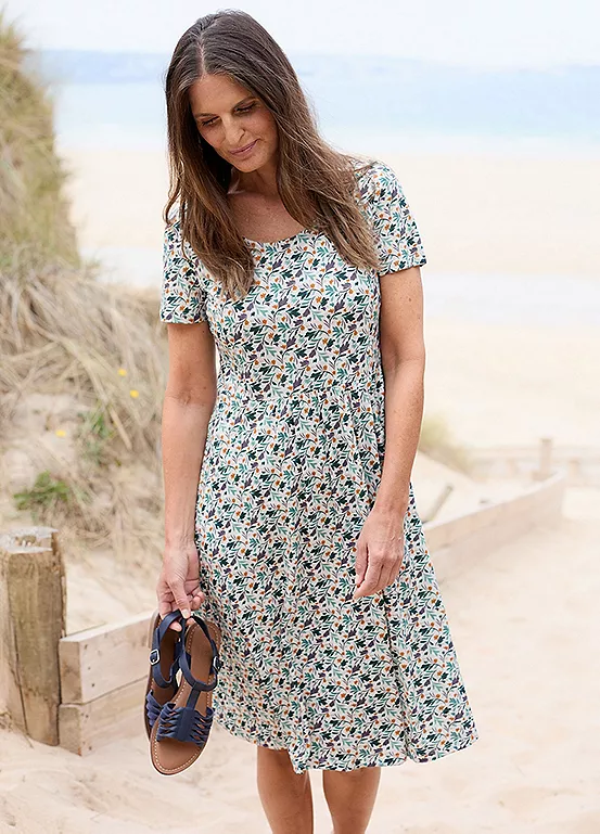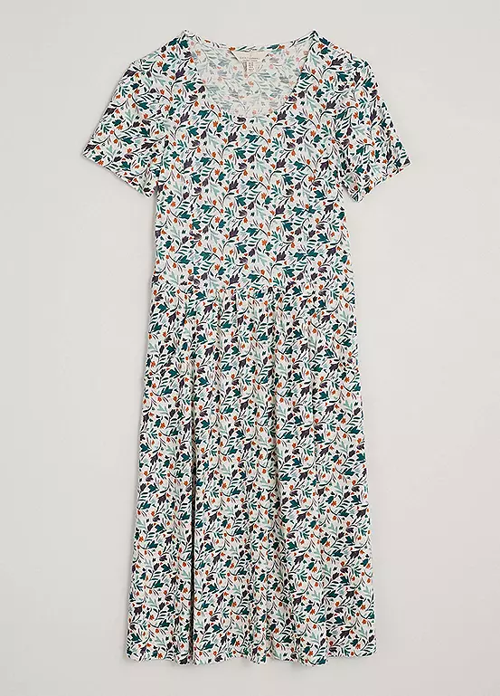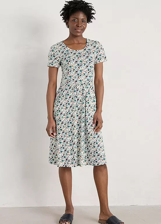 A short-sleeved organic cotton dress with a scoop neck and side pockets.