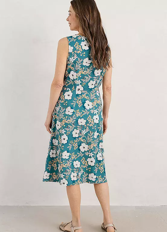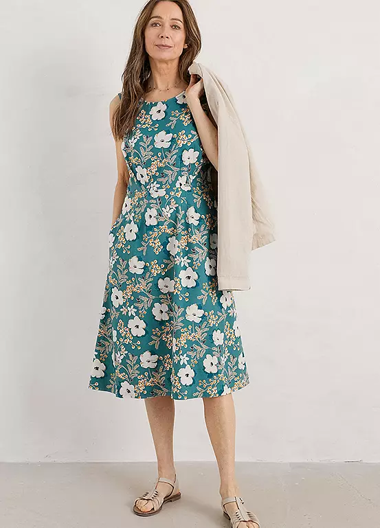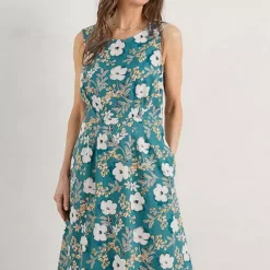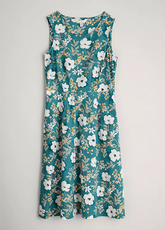 Below-the-knee length sleeveless fit and flare dress in 100% cotton.
