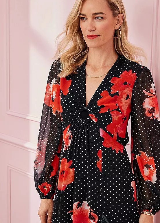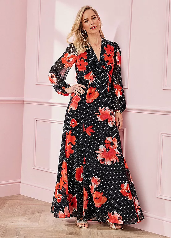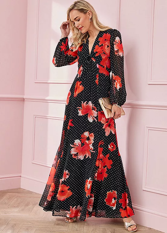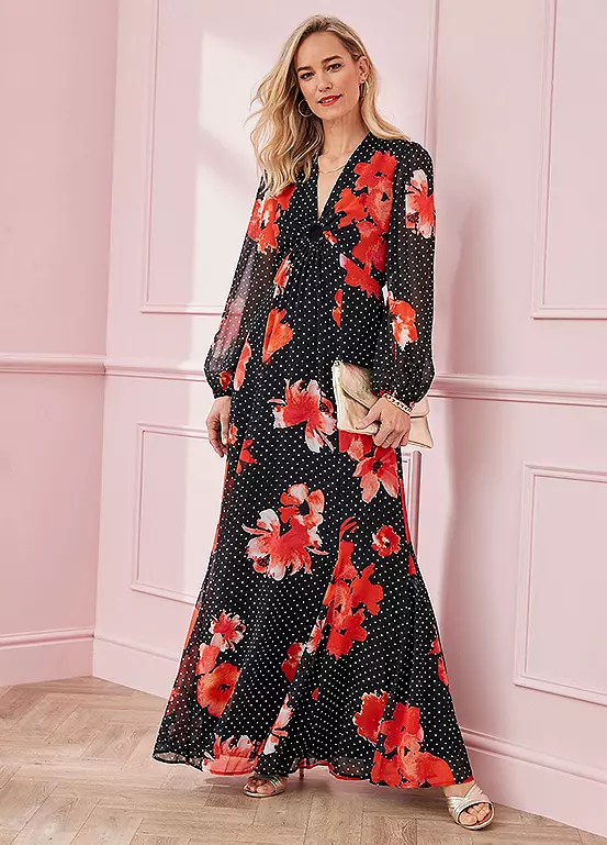 Opt for an elegant silhouette with our maxi dress. Featuring a stunning mixed floral and spot print, this easy pull-on style also features a v neckline with a higher waist, blouson detail sleeves and godet detail to the skirt.