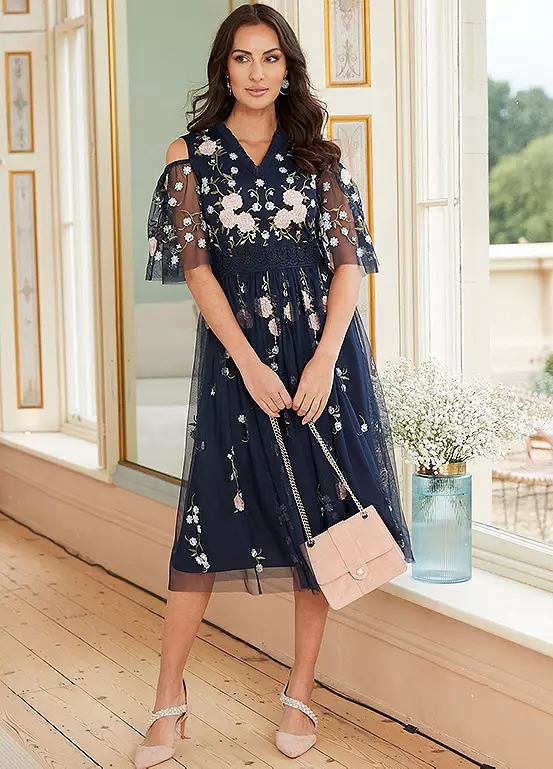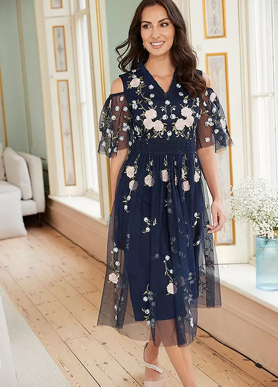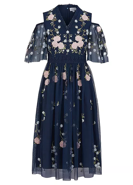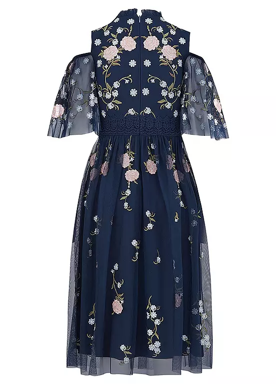 Cut in a classic prom style this beautiful dresses comes with pretty contrast blush embroidery detail and lace trim to the waist, frill detail to the v neckline and has cold shoulder detail.