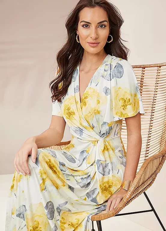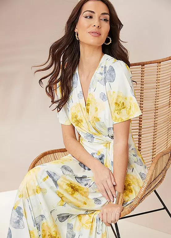 This gorgeous print dress is in a fluid luxurious jersey fabric. Wonderfully comfortable and flattering this dress comes fully lined. The floral print is inspired by botanical gardens and features a wrap detail bodice and a waterfall skirt. With short sleeves, it is a perfect dress for your special occasion, from smart parties to weddings.
