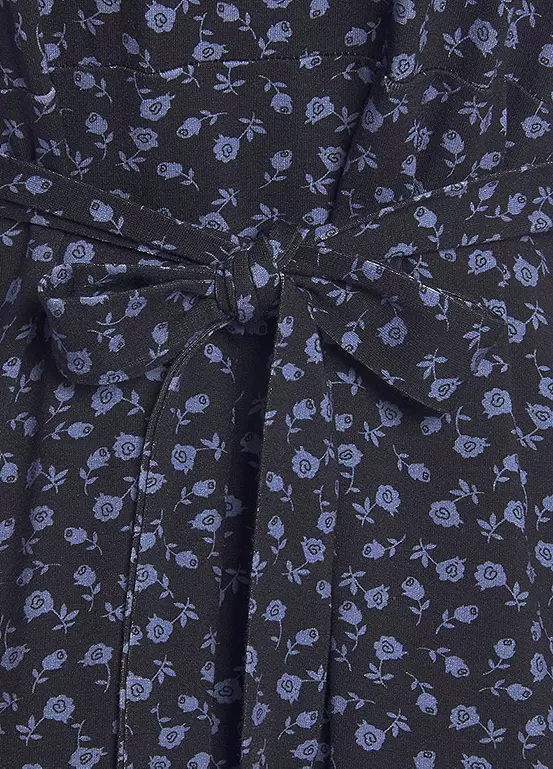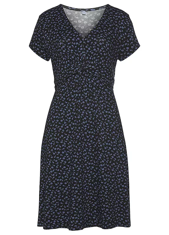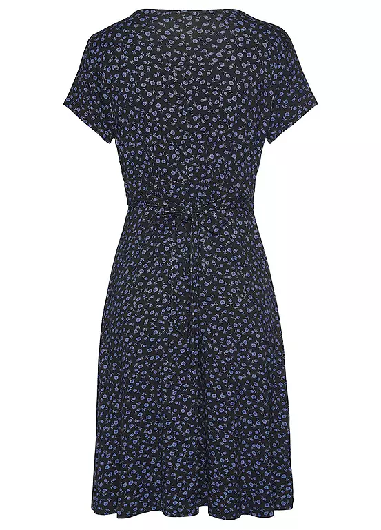 Fashionable jersey dress in an all-over floral print that creates an eye-catching look. It comes with short sleeves, a deep v-neckline, ruffles under the chest and a figure-flattering fit. Gathering below the chest is created by a tie that comes together at the front and is tied into a cute bow at the back.