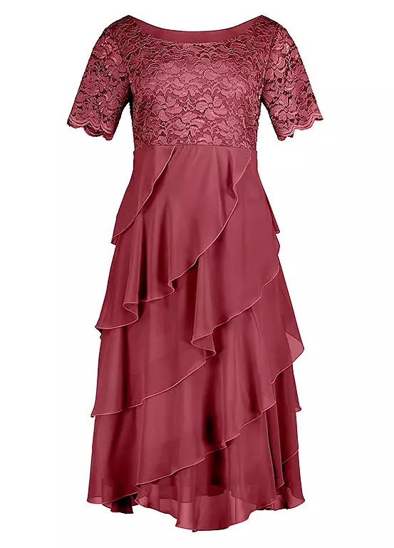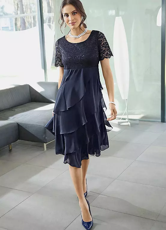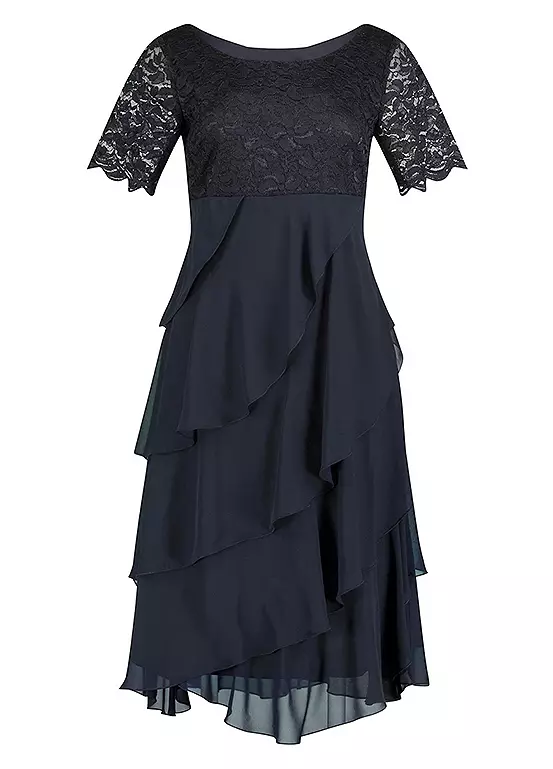 Become the centre of attention with this flattering dress! The top part and short sleeves with curved hems are made of fine lace that is slightly sheer on the arms. The layered look is created by the slanted ruffles made of fine chiffon fabric in the lower part. Opaque thanks to the jersey lining. With wide rounded neckline and side zip.